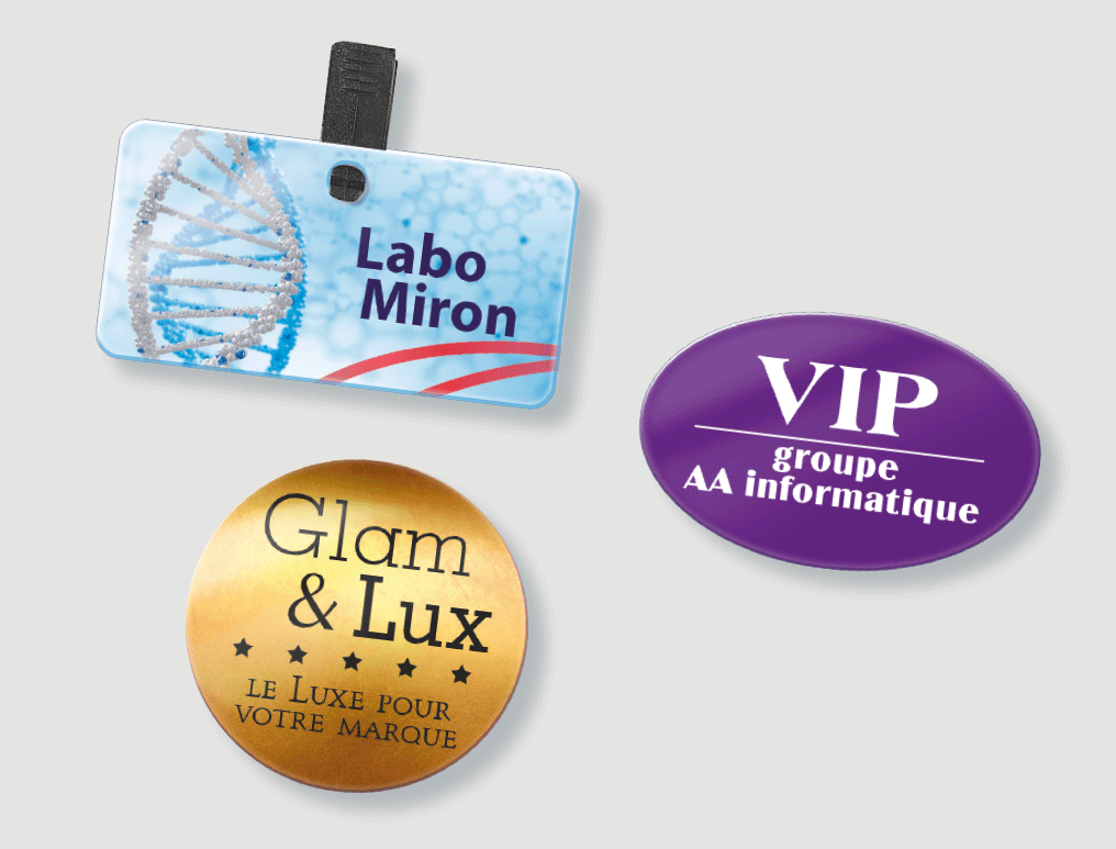 Réalisation de badges imprimés ou gravés à votre marque. Nominatifs ou par quantités sur un grand nombre de supports.