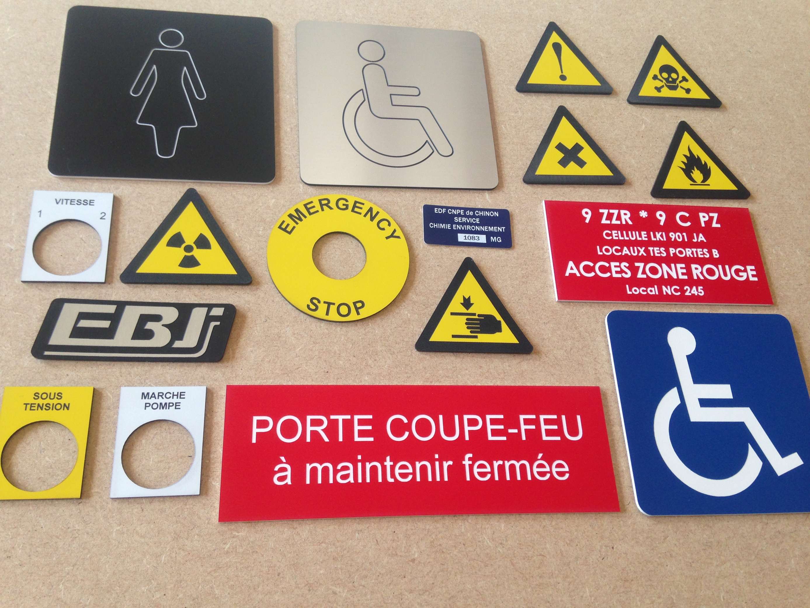 Étiquettes industrielles en gravoply, plexiglas, laiton, alu …